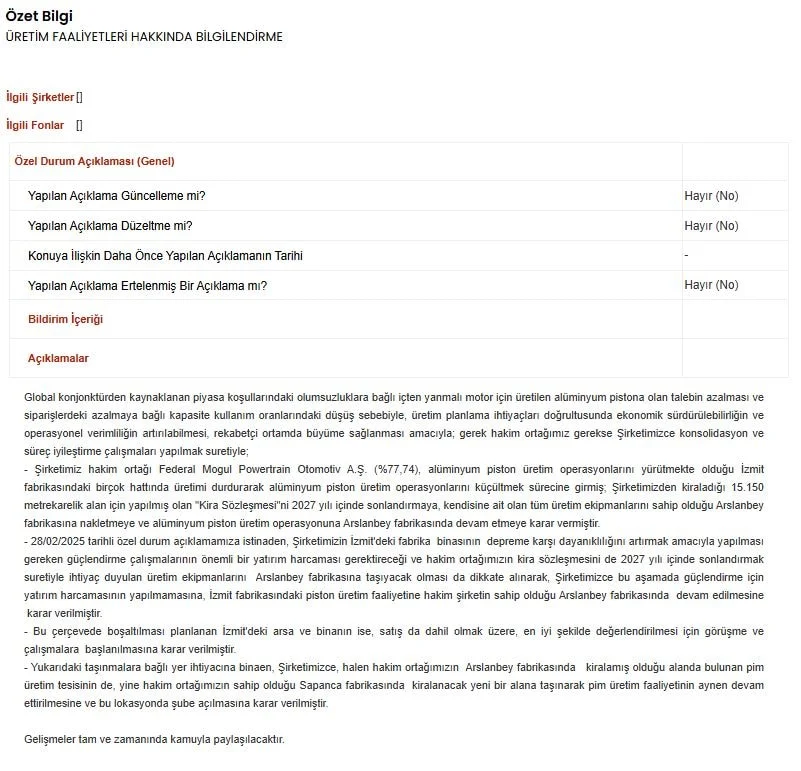 Türkiye otomotiv sanayisinde köklü bir geçmişe sahip olan Federal Mogul İzmit Piston ve Pim Üretim Tesisleri A.Ş., üretim yapılanmasını köklü şekilde değiştiriyor. Kamuyu Aydınlatma Platformu’na yapılan açıklamaya göre şirket, İzmit Plajyolu’ndaki tesislerini kapatarak faaliyetlerini farklı lokasyonlara kaydırma kararı aldı.